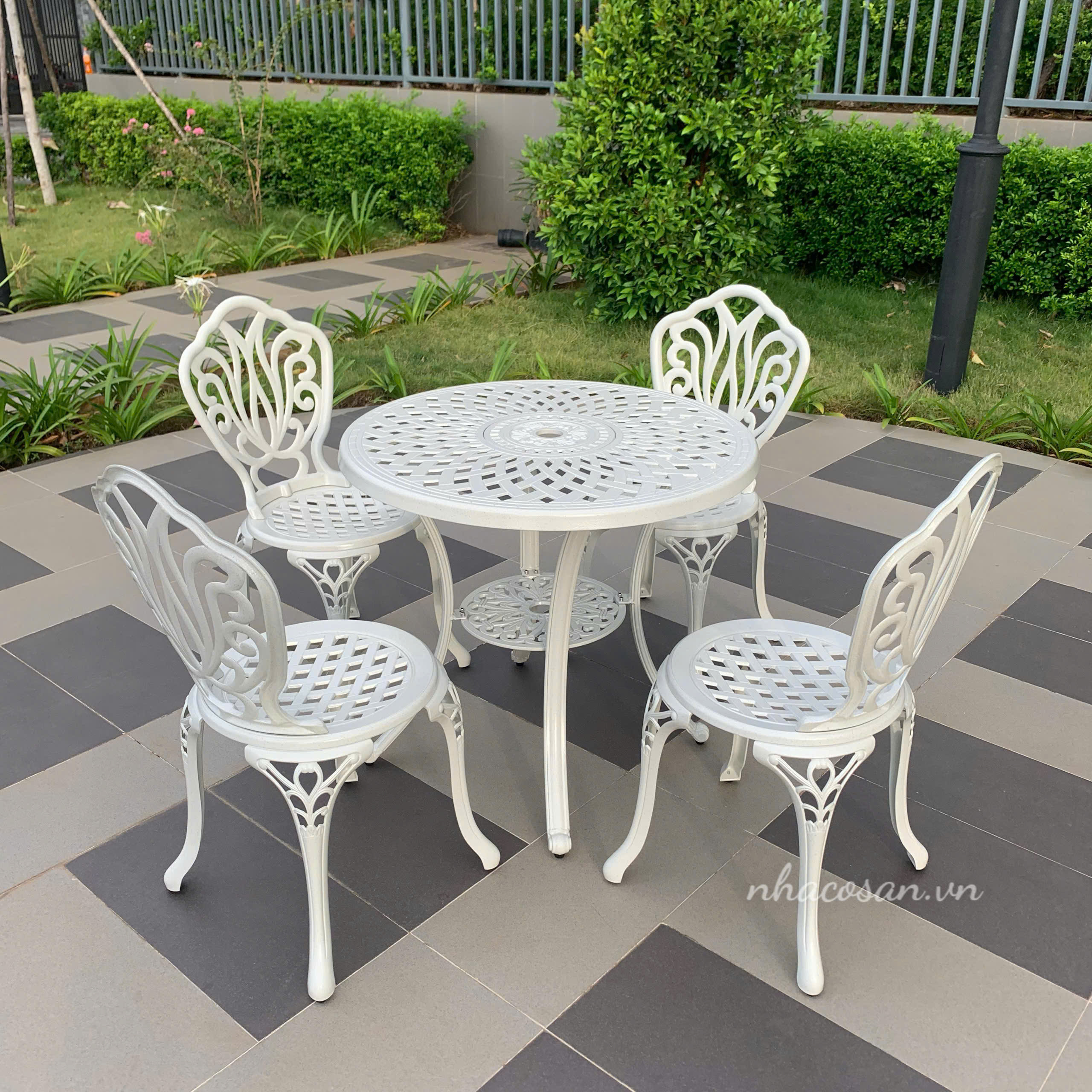 Bộ Bàn Ghế Sân Vườn 4 Ghế Hợp Kim Nhôm Đúc Màu Trắng Tinh Khôi